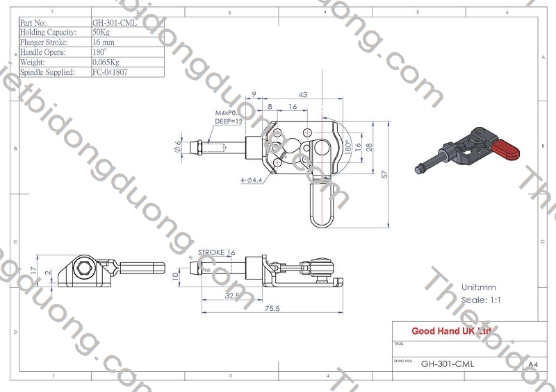 Bản vẽ kỹ thuật của sản phẩm và catalogue cam kẹp định vị GH301CML: